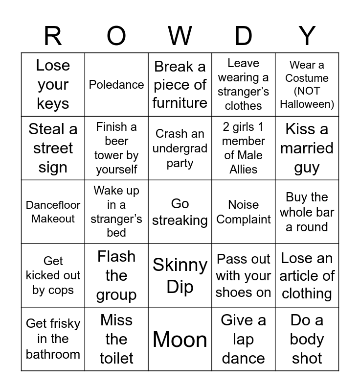 This bingo card has 35 words: Beer Bong!, Sweaty bump and grind session, Hook up with a member of your cohort, Finish a beer tower by yourself, Skinny Dip, Leave wearing a stranger’s clothes, Steal a street sign, Get kicked out of a bar, Crash an undergrad party, Hook up with a 2Y, Dancefloor Makeout, Wear a Costume (NOT Halloween), Keg Stand, Throw Up, Lose your keys, Noise Complaint, Give a lap dance, Wake up in a stranger’s bed, Get kicked out by cops, Go streaking, Pass out with your shoes on, Get frisky in the bathroom, Lose an article of clothing, Miss the toilet, Break a piece of furniture, Kiss a married guy, Do a body shot, Devil's three-way, 2 girls 1 member of Male Allies, Buy the whole bar a round, Show an international how American's do it (or vice versa), Moon, Flash the group, Poledance and Spill your drink... again.