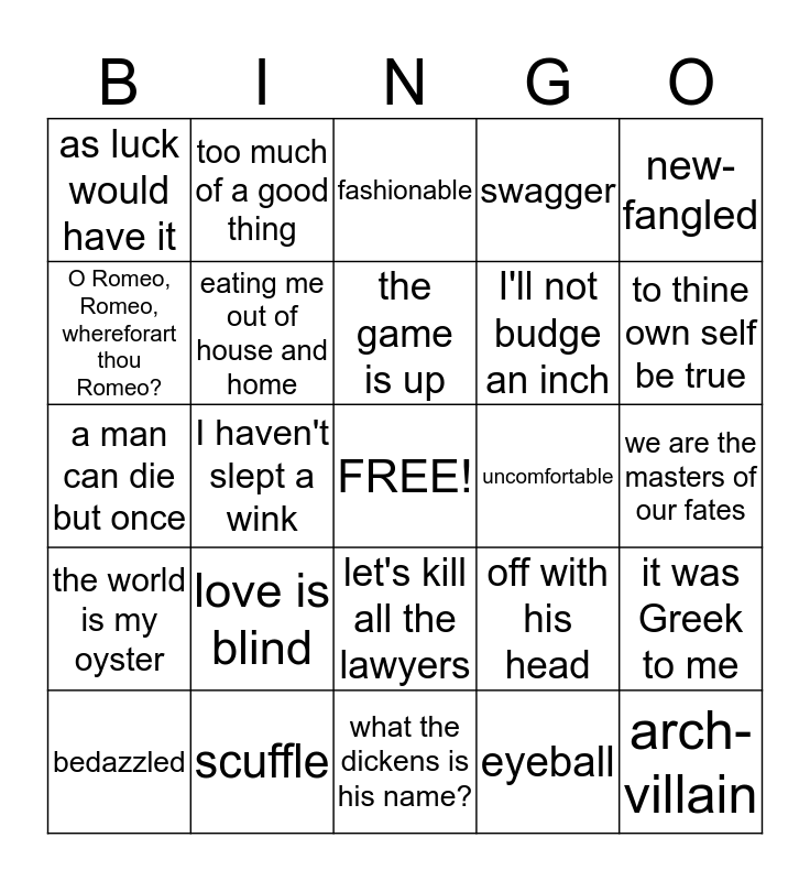 This bingo card has a free space and 44 words: addiction, arch-villain, assassination, bedazzled, cold-blooded, eyeball, fashionable, ladybird, new-fangled, scuffle, swagger, uncomfortable, let's kill all the lawyers, love is blind, give the devil his due, what the dickens is his name?, the lady doth protest too much, a man can die but once, a charmed life, to thine own self be true, too much of a good thing, forever and a day, brevity is the soul of wit, as luck would have it, we have seen better days, we are the masters of our fates, a dish fit for the gods, the stuff dreams are made of, off with his head, the world is my oyster, the play's the thing, it was Greek to me, to be or not to be, a horse, a horse, my kingdom for a horse, I haven't slept a wink, that's the long and short of it, out of the jaws of death, what's in a name, the game is up, O Romeo, Romeo, whereforart thou Romeo?, I'll not budge an inch, is this a dagger I see before me?, eating me out of house and home and in my mind's eye.