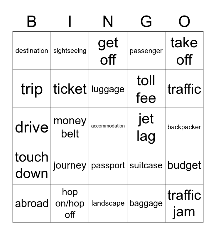 This bingo card has a free space and 24 words: journey, hop on/hop off, luggage, abroad, take off, destination, trip, sightseeing, jet lag, passport, toll fee, drive, suitcase, budget, ticket, baggage, backpacker, get off, traffic, money belt, traffic jam, touch down, passenger and landscape.