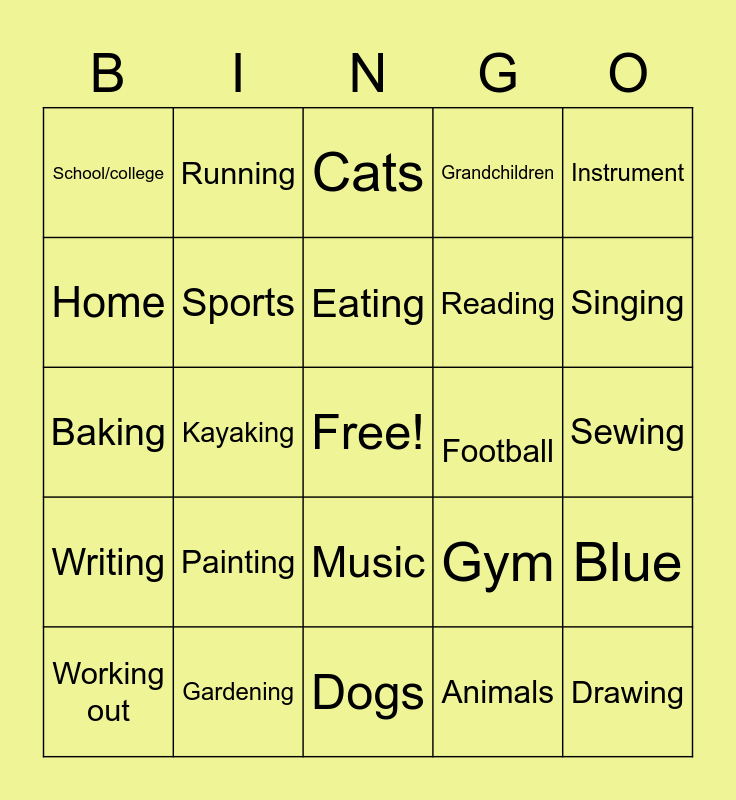 This bingo card has a free space and 24 words: Painting, Gardening, Eating, Working out, Instrument, School/college, Home, Running, Football, Music, Reading, Baking, Gym, Blue, Sports, Animals, Sewing, Cats, Singing, Kayaking, Drawing, Writing, Grandchildren and Dogs.