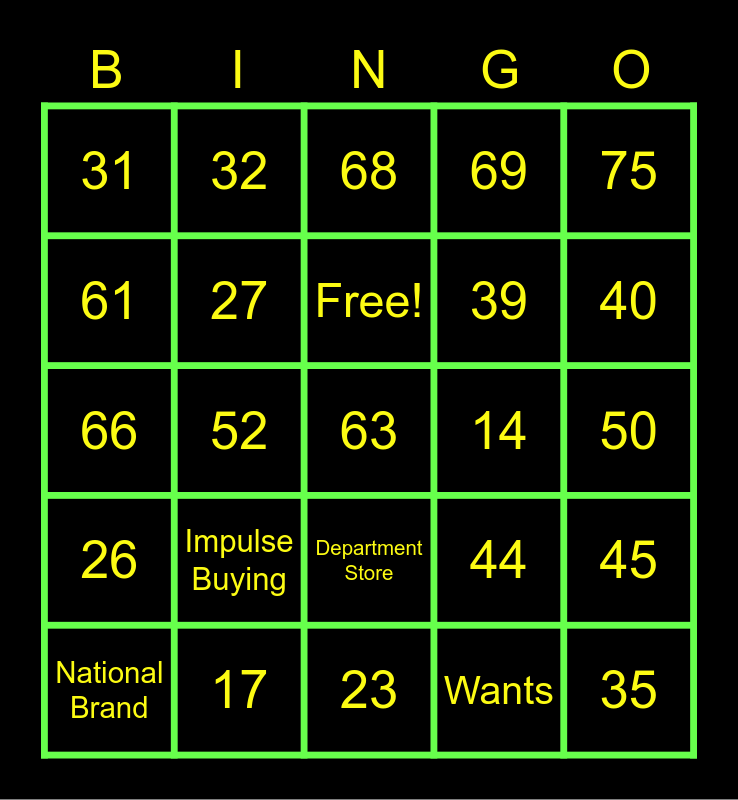 This bingo card has 101 words: 1, 2, Free!, 4, 5, 6, 7, 3, 9, 10, 11, 12, 8, 14, 15, 16, 17, 13, 19, 20, 21, 22, 18, 24, 25, 26, 27, 23, 29, 30, 31, 32, 28, 34, 35, 36, 37, 33, 39, 40, 41, 42, 38, 44, 45, 46, 47, 43, 49, 50, 51, 52, 48, 54, 55, 56, 57, 53, 59, 60, 61, 62, 58, 64, 65, 66, 67, 63, 69, 70, 71, 72, 68, 74, 75, National Brand, Convenience Store, 73, Specialty Store, Unit Price, Timing your Purchase, Planning your Route, Department Store, Scarcity, Clearance Sales, Discount Store, Impulse Buying, Limited Resources, Reputation, Shopping List, Needs, Factors of Production, Supermarket, Factory Outlet, Promotional Sale, Warehouse Market, Store Brand, Comparison Shopping, Wants, Capital Resources and National Brand.