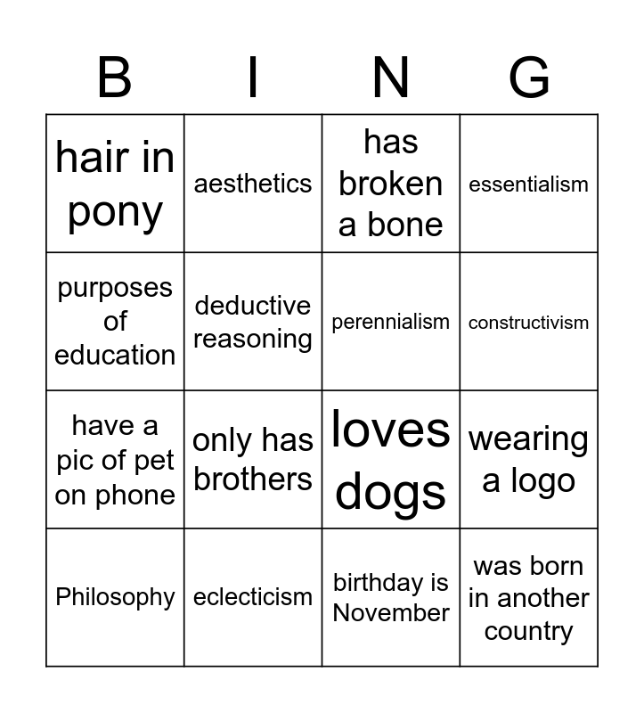 This bingo card has 51 words: Free!, Philosophy, metaphysics, epistemology, axiology, ethics, aesthetics, logic, deductive reasoning, inductive reasoning, perennialism, essentialism, romanticism, progressivism, John Dewey, behaviorism, constructivism, eclecticism, philosophy paper, purposes of education, wearing a logo, wearing black socks, hair in pony, have a pic of pet on phone, is a twin or has a twin, plays a sport for U of A, only has brothers, only has sisters, has naturally curly hair, has broken a bone, does not like chocolate, favorite beverage is tea, is an only child, has more than 3 pets, watched more than one episode of a show this weekend, Birthday is in October, loves winter, wears glasses, doesnt go by first name, can roll their r's, birthday is November, was born in another country, knows what ADE stands for, loves country music, has been to Europe, is the youngest in family, loves dogs, transferred from another university, hates being late, is never on time and saw Arkansas win against ole miss.