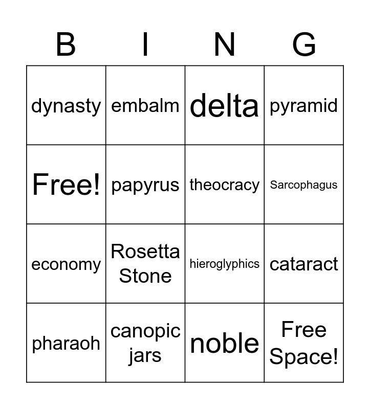 This bingo card has 16 words: canopic jars, cataract, delta, dynasty, economy, embalm, hieroglyphics, noble, Free!, papyrus, pharaoh, pyramid, Rosetta Stone, Sarcophagus, theocracy and Free Space!.