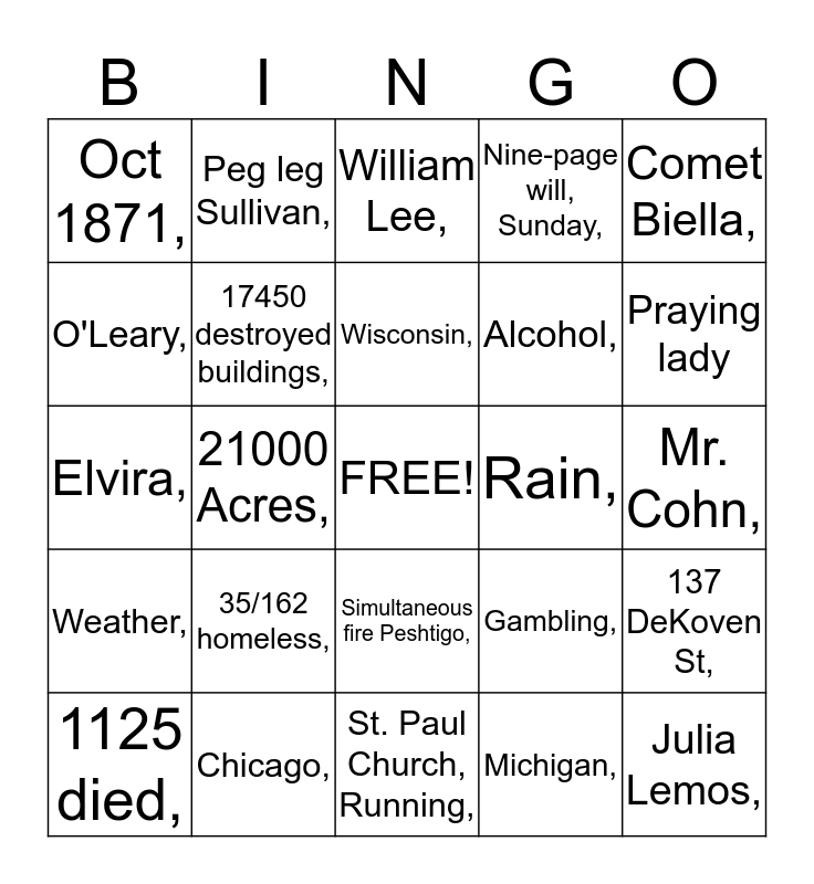 This bingo card has a free space and 26 words: Simultaneous fire Peshtigo,, Michigan,, Wisconsin,, Chicago,, Comet Biella,, Oct 1871,, O'Leary,, Peg leg Sullivan,, Mr. Cohn,, Gambling,, Alcohol,, Elvira,, 137 DeKoven St,, 1125 died,, 21000 Acres,, People care,, Nine-page will, Sunday,, Weather,, William Lee,, Julia Lemos,, Praying lady, St. Paul Church, Running,, Rain,, 35/162 homeless,, 17450 destroyed buildings, and Prayer for rain.