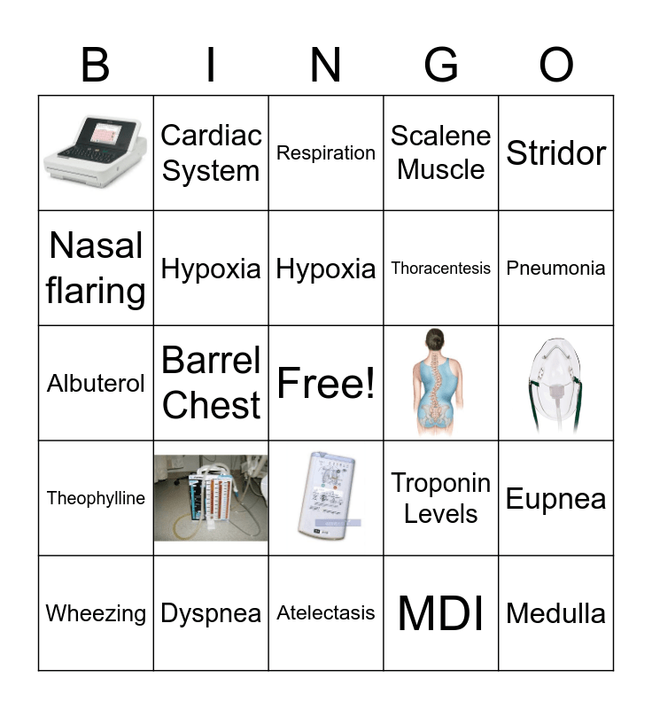 This bingo card has 7 images, a free space and 22 words: Wheezing, Hematocrit, Barrel Chest, Respiration, Hypoxia, Dyspnea, Medulla, Atelectasis, MDI, Pneumonia, Diphenhydramine, Theophylline, Stridor, Albuterol, Troponin Levels, Thoracentesis, Nasal flaring, Scalene Muscle, Cardiac System, Eupnea, Hypoxia and Cyanosis.