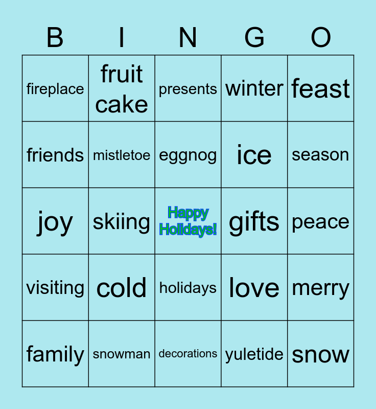 This bingo card has a free space and 25 words: cold, decorations, eggnog, family, feast, fireplace, friends, fruit cake, gifts, holidays, ice, joy, love, merry, mistletoe, ornaments, peace, presents, season, skiing, snow, snowman, visiting, winter and yuletide.