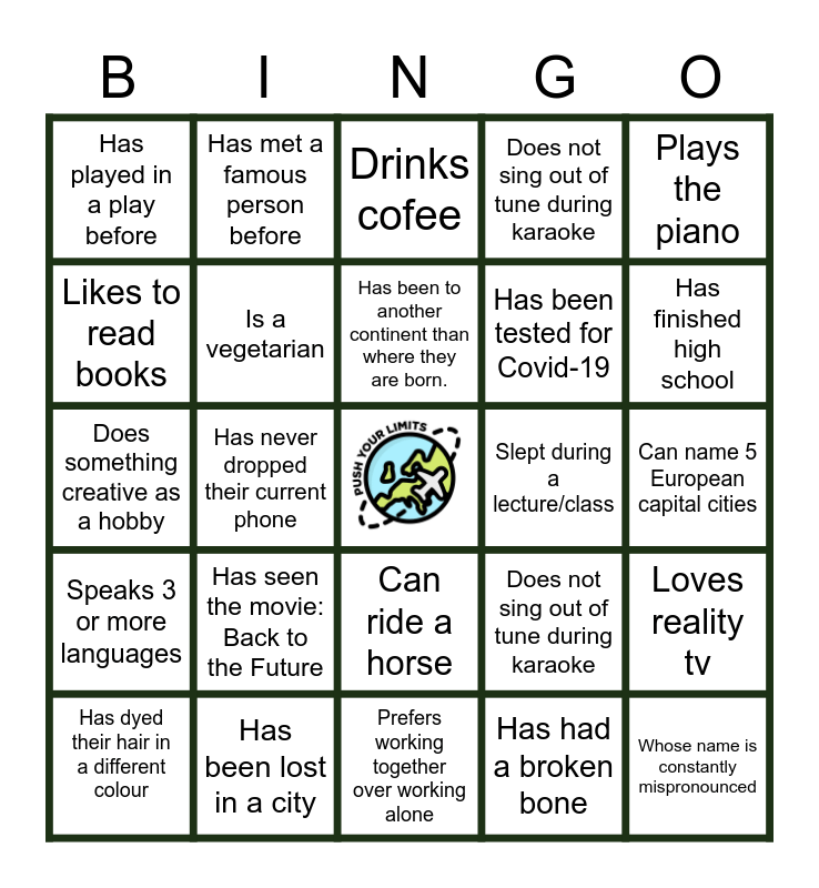 This bingo card has a free space and 34 words: Has a cat, Has had a broken bone, Has been to the Netherlands before, Has been volunteering, Speaks 3 or more languages, Is a vegetarian, Plays the piano, Has dyed their hair in a different colour, Has met a famous person before, Doesn’t like chocolate, Has been to another continent than where they are born., Drinks cofee, Has a job, Has participated in an Erasmus+ project before, Slept during a lecture/class, Has finished high school, Has been lost in a city, Does something creative as a hobby, Has seen the movie: Back to the Future, Does not sing out of tune during karaoke, Can ride a horse, Has a driver’s license, Has played in a play before, Can name 5 European capital cities, Prefers working together over working alone, Whose name is constantly mispronounced, Does not sing out of tune during karaoke, Likes cheese and/or liquorice, Has been tested for Covid-19, Likes to read books, Favourite colour is orange, Has never dropped their current phone, Loves reality tv and Has played in a band.