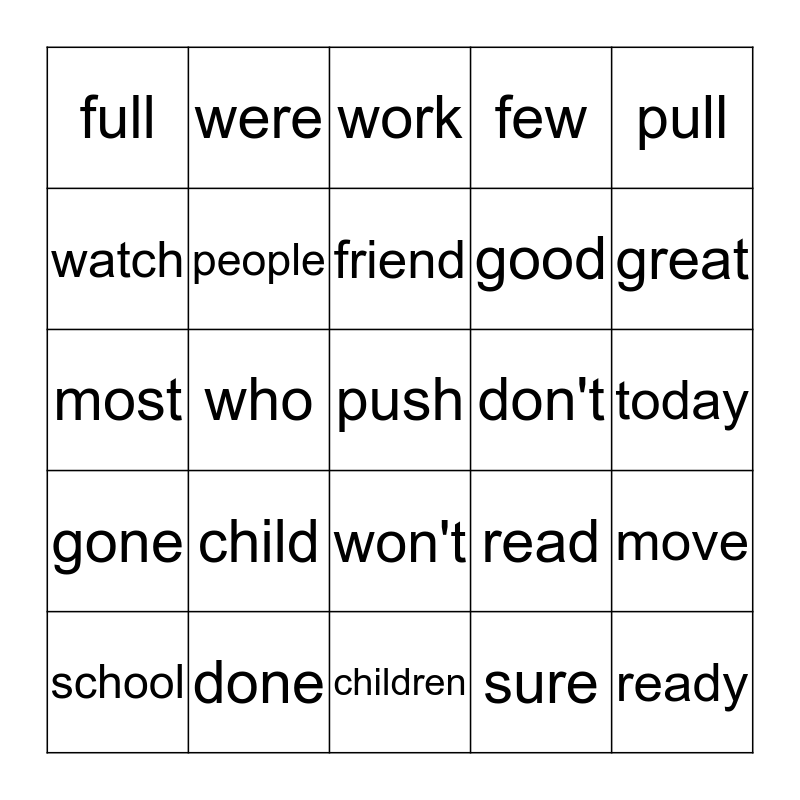This bingo card has 25 words: child, children, friend, school, pull, full, watch, were, don't, won't, good, most, read, move, people, ready, today, work, great, who, push, done, gone, few and sure.