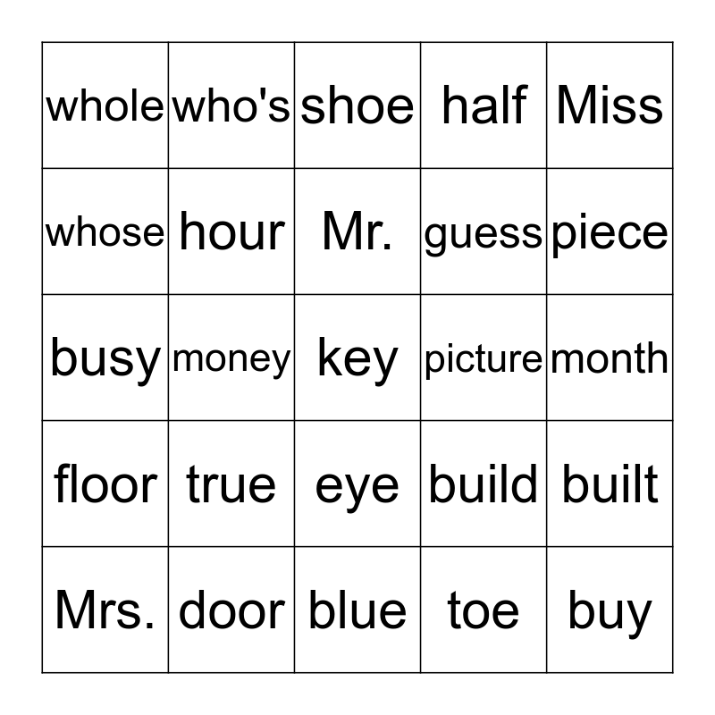 This bingo card has 25 words: true, blue, Mr., Mrs., Miss, whole, whose, who's, picture, eye, guess, busy, build, built, hour, buy, month, shoe, piece, money, key, door, floor, half and toe.
