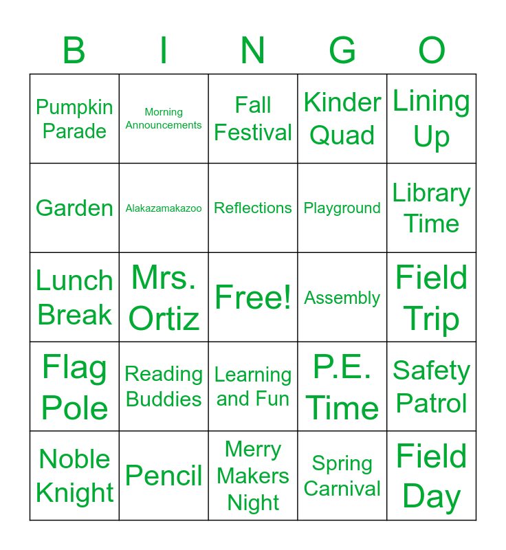 This bingo card has a free space and 29 words: Noble Knight, Noble Elementary, Mrs. Ortiz, Mrs. Ryan, Pumpkin Parade, Fall Festival, Alakazamakazoo, Reading Buddies, Assembly, Pencil, Field Trip, Field Day, Merry Makers Night, Spring Carnival, Library Time, 100th Day of School, Learning and Fun, Flag Pole, Lining Up, Lunch Break, P.E. Time, Turnabout, Playground, Garden, Kinder Quad, Morning Announcements, Safety Patrol, Reflections and Math Class.