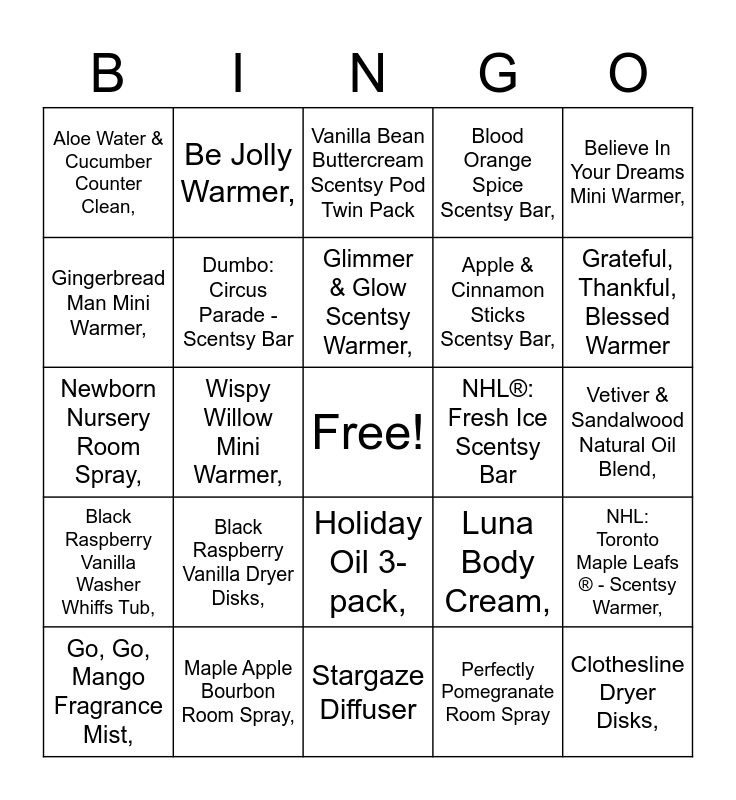 This bingo card has a free space and 65 words: Scentsy Go Rose Gold,, Cozy Cardigan – Buttercup Belle Fragrance Flower,, Sea Salt & Avocado – Dahlia Darling Fragrance Flower,, NHL: Toronto Maple Leafs ® - Scentsy Warmer,, Apricot Vanilla Lotion,, Shimmer Lotion,, Be Jolly Warmer,, Crystallize – Blue Warmer,, Glimmer & Glow Scentsy Warmer,, In the Clouds Warmer,, Holiday Oil 3-pack,, Ocean Mist & Aloe Natural Oil Blend,, Vetiver & Sandalwood Natural Oil Blend,, Believe In Your Dreams Mini Warmer,, Chasing Fireflies Mini Warmer,, Gingerbread Man Mini Warmer,, Wispy Willow Mini Warmer,, Aloe Water & Cucumber Counter Clean,, Amazon Rain Scent Circle,, Apple & Cinnamon Sticks Scentsy Bar,, Black Raspberry Vanilla Dryer Disks,, Black Raspberry Vanilla Washer Whiffs Tub,, Blood Orange Spice Scentsy Bar,, Blue Grotto Bathroom Cleaner,, Blueberry Cheesecake Scent Circle,, Christmas Cottage Scent Pak,, Cinnamon Bear Room Spray,, Clean Breeze Scentsy Car Bar,, Clothesline Dryer Disks,, Coconut Lemongrass Scentsy Bar,, Go, Go, Mango Fragrance Mist,, Hug in a Mug Scent Circle,, Jammy Time Body Wash,, Just Breathe Scent Pak,, Luna Body Cream,, Maple Apple Bourbon Room Spray,, Mystery Man Room Spray,, Newborn Nursery Room Spray,, Perfectly Pomegranate Room Spray, Sea Salt & Avocado Scent Circle, Dumbo: Circus Parade - Scentsy Bar, Let it Snow Scentsy Bar 3-pack, NHL®: Fresh Ice Scentsy Bar, Walnut Raisin Muffin Scentsy Bar, Angel Wings Warmer, Country Living Warmer, Grateful, Thankful, Blessed Warmer, Pear-fect Warmer, Dream It, Live It, Love It Mini Warmer, Glitter Silver Mini Warmer, Jack Skellington: Pumpkin King – Scentsy Mini Warmer, Reflect Diffuser, Crystallize - Shade Only, Stargaze Diffuser, Wall Fan Diffuser with Snowflake Light - Spin, Berry Blessed Pod Twin Pack, First Day of Fall Pod Twin Pack, Vanilla Bean Buttercream Scentsy Pod Twin Pack, Honey Pear Cider Travel Tin, Weathered Leather Travel Tin, Cider Mill Clean Bundle, Shimmer Body Cream, Cotton Cleanup, Scentsy Warmer Stand-Round and Tabletop Base for Ceramic & Metal Mini Warmers.