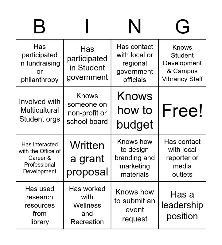 This bingo card has 17 words: Knows how to submit an event request, Has used research resources from library, Has contact with local or regional government officials, Has participated in fundraising or philanthropy, Written a grant proposal, Knows Student Development & Campus Vibrancy Staff, Has contact with local reporter or media outlets, Knows how to budget, Free!, Knows someone on non-profit or school board, Has worked with Wellness and Recreation, Knows how to design branding and marketing materials, Involved with Multicultural Student orgs, Has participated in Student government, Has interacted with the Office of Career & Professional Development, Knows an AmeriCorps VISTA and Has a leadership position.