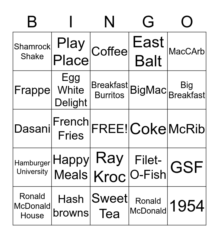 This bingo card has a free space and 24 words: Happy Meals, Hash browns, Breakfast Burritos, Ronald McDonald House, MacCArb, Shamrock Shake, Frappe, Play Place, Coke, Ray Kroc, BigMac, Dasani, Filet-O-Fish, GSF, Egg White Delight, Ronald McDonald, McRib, Coffee, Big Breakfast, French Fries, 1954, Hamburger University, East Balt and Sweet Tea.