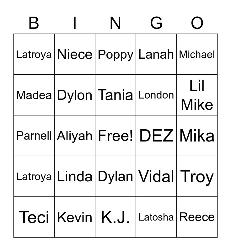 This bingo card has a free space and 24 words: Linda, Kevin, Tania, Teci, Michael, Latroya, Madea, Niece, DEZ, Dylan, London, Parnell, Vidal, Troy, Dylon, Latosha, Mika, Poppy, Lil Mike, Aliyah, Reece, Latroya, Lanah and K.J..