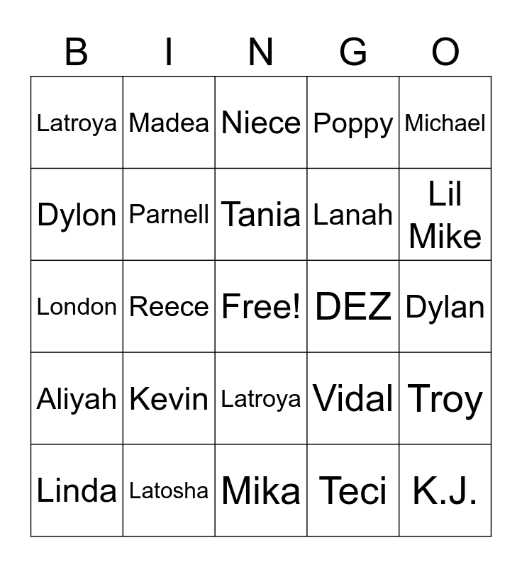 This bingo card has a free space and 24 words: Linda, Kevin, Tania, Teci, Michael, Latroya, Madea, Niece, DEZ, Dylan, London, Parnell, Vidal, Troy, Dylon, Latosha, Mika, Poppy, Lil Mike, Aliyah, Reece, Latroya, Lanah and K.J..
