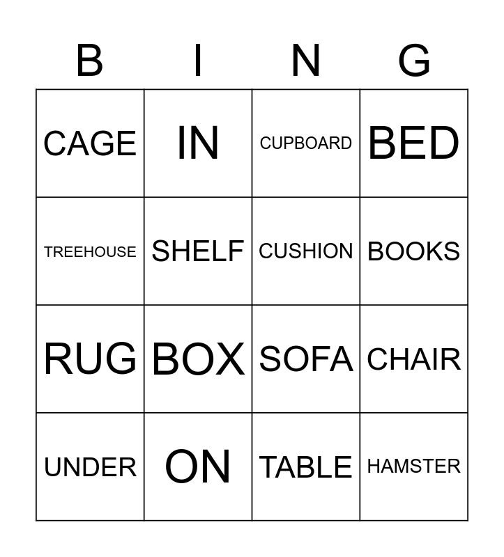 This bingo card has 16 words: ON, CHAIR, CUPBOARD, CAGE, RUG, IN, SOFA, TABLE, TREEHOUSE, SHELF, UNDER, BED, BOX, BOOKS, CUSHION and HAMSTER.