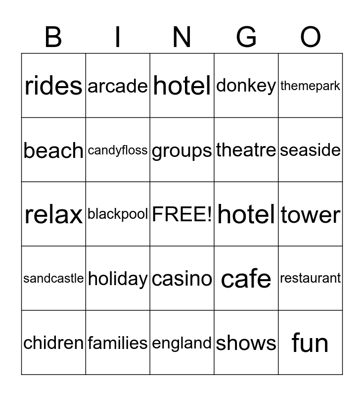 This bingo card has a free space and 24 words: holiday, families, groups, chidren, themepark, rides, beach, arcade, hotel, casino, theatre, relax, cafe, restaurant, candyfloss, shows, tower, hotel, seaside, blackpool, fun, sandcastle, donkey and england.