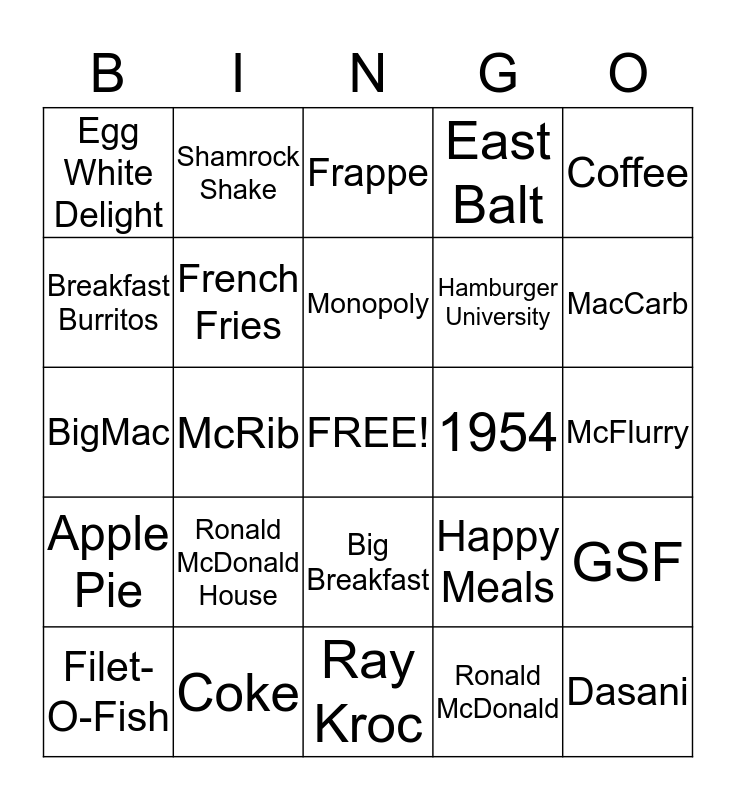 This bingo card has a free space and 24 words: Ronald McDonald House, Coke, Monopoly, Filet-O-Fish, Coffee, Egg White Delight, Breakfast Burritos, Shamrock Shake, 1954, Big Breakfast, Hamburger University, BigMac, Happy Meals, GSF, French Fries, Ronald McDonald, McFlurry, Frappe, MacCarb, McRib, Dasani, Apple Pie, East Balt and Ray Kroc.