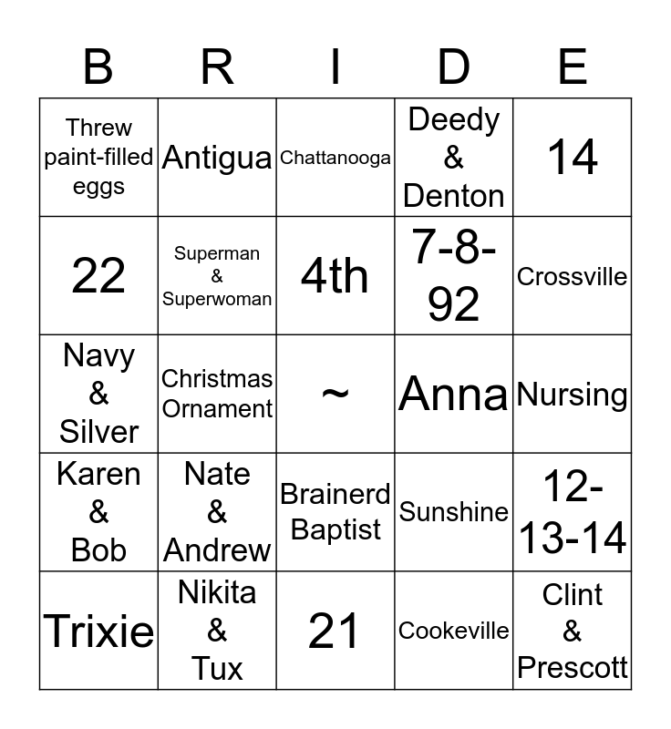 This bingo card has a free space and 24 words: Nate & Andrew, Nikita & Tux, 4th, Trixie, 14, Threw paint-filled eggs, 22, Antigua, Anna, Brainerd Baptist, 7-8-92, Navy & Silver, Sunshine, 12-13-14, Superman & Superwoman, Cookeville, Nursing, Chattanooga, Crossville, Christmas Ornament, Clint & Prescott, Karen & Bob, Deedy & Denton and 21.