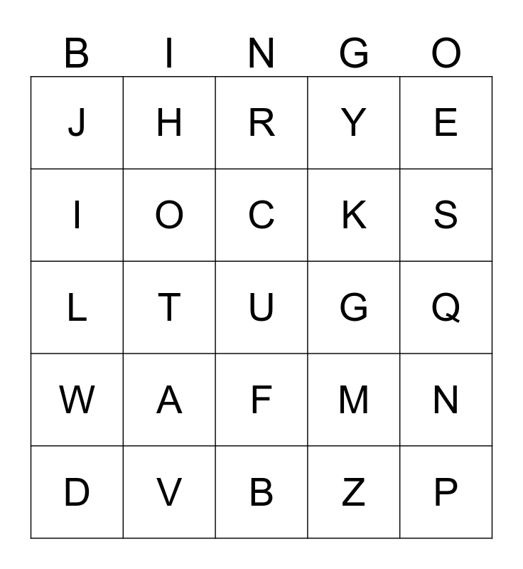This bingo card has 25 words: A, B, C, D, E, J, I, H, G, F, K, L, M, N, O, P, Q, R, S, T, U, V, W, Y and Z.