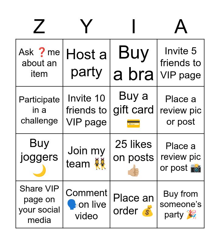 This bingo card has 19 words: 25 likes on posts ππΌ, Invite 5 friends to VIP page, Buy a bra, Buy from someoneβs party π, Place a review pic or post πΈ, Participate in a challenge, Place an order π°, Ask βme about an item, Host a party, Buy joggers π, Join my team π―ββοΈ, Invite 10 friends to VIP page, Buy a gift card π³, Comment π£on live video, Share VIP page on your social media, Place an order over $100 π°π°, Invite 5 friends to VIP page, Place a review pic or post and 25 likes on posts.