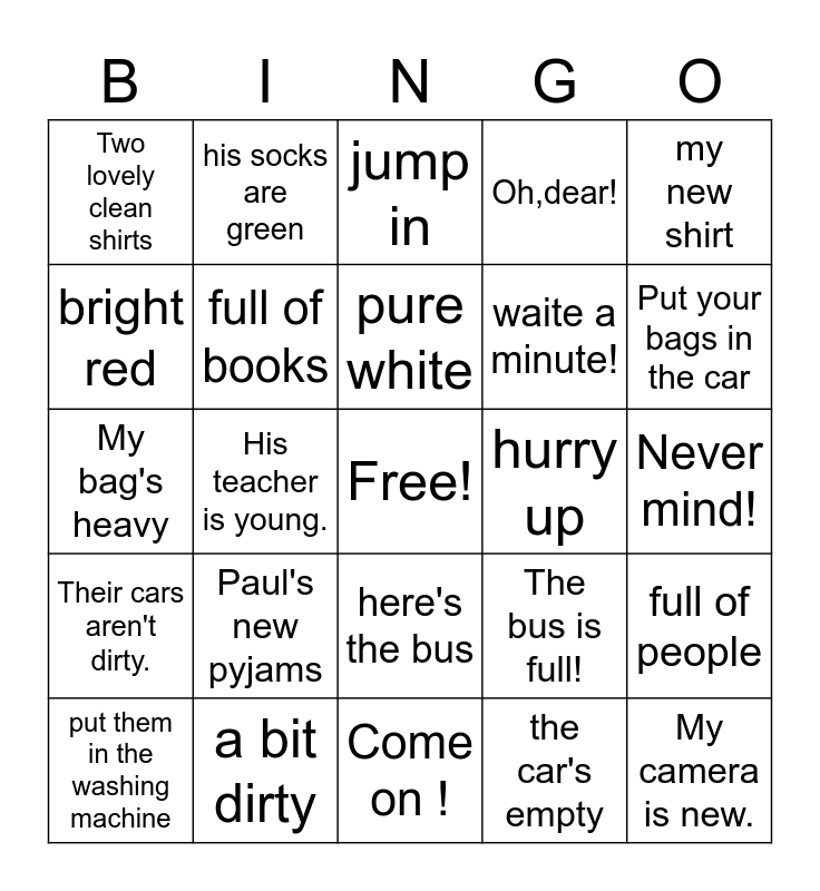 This bingo card has a free space and 24 words: Paul's new pyjams, a bit dirty, pure white, put them in the washing machine, my new shirt, Two lovely clean shirts, bright red, his socks are green, hurry up, here's the bus, waite a minute!, My bag's heavy, The bus is full!, full of people, full of books, the car's empty, Never mind!, jump in, Put your bags in the car, His teacher is young., My camera is new., Their cars aren't dirty., Oh,dear! and Come on !.