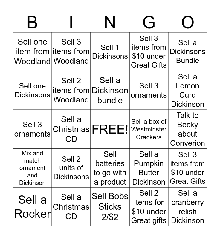 This bingo card has a free space and 24 words: Sell 2 units of Dickinsons, Sell a Christmas CD, Sell a Dickinson bundle, Sell a Rocker, Sell a Dickinsons Bundle, Sell one item from Woodland, Sell one Dickinsons, Sell 3 items from Woodland, Sell a box of Westminster Crackers, Sell batteries to go with a product, Sell 3 ornaments, Sell 3 ornaments, Sell a Pumpkin Butter Dickinson, Sell 3 items from $10 under Great Gifts, Sell 2 items from Woodland, Sell 2 items for $10 under Great gifts, Talk to Becky about Converion, Sell 1 Dickinsons, Sell a Lemon Curd Dickinson, Sell a Christmas CD, Sell a cranberry relish Dickinson, Mix and match ornament and Dickinson, Sell 3 items from $10 under Great Gifts and Sell Bobs Sticks 2/$2.