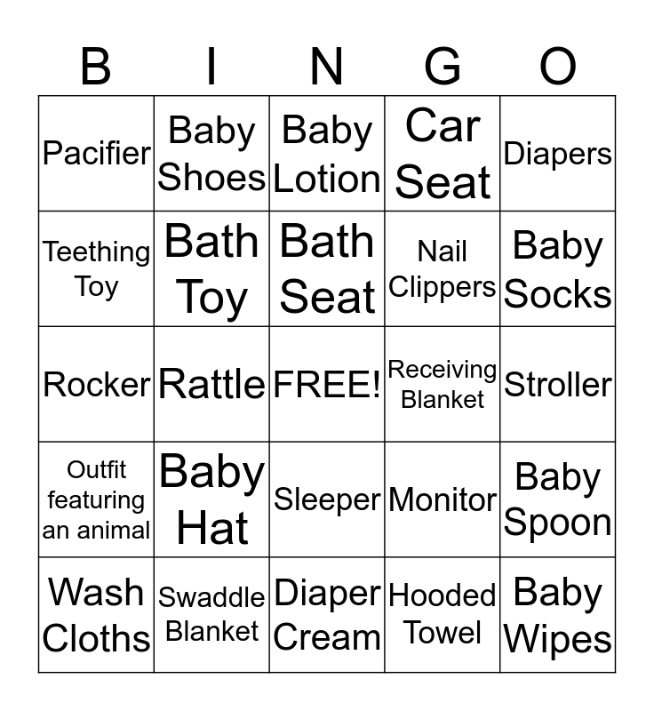 This bingo card has a free space and 31 words: Diaper Cream, Onesie, Rattle, Gift Card, Pacifier, Baby Lotion, Bath Toy, Monitor, Receiving Blanket, Hooded Towel, Stroller, Baby Wipes, Baby Shampoo, Bib, Baby Socks, Burb Cloths, Baby Spoon, Baby Hat, Outfit featuring an animal, Sleeper, Diapers, Bottles, Wash Cloths, Baby Shoes, Nail Clippers, Teething Toy, Car Seat, Rocker, Swaddle Blanket, Bath Seat and Baby Toy.