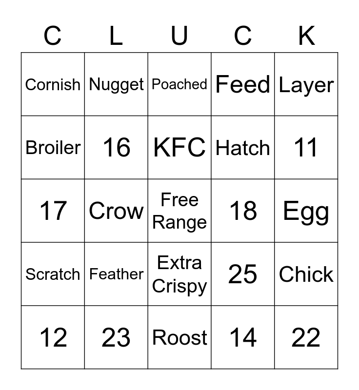 This bingo card has a free space and 64 words: Bantam, Rooster, Hen, Chick, Drumstick, Foghorn Leghorn, Nugget, Sauce, KFC, CFA, Extra Crispy, Comb, Egg, Layer, Fryer, Broiler, Crow, Cornish, RI Red, Hatch, Feather, Scratch, Feed, Wishbone, 1, 2, 3, 4, 5, 6, 7, 8, 9, 10, 11, 12, 13, 14, 15, 16, 17, 18, 19, 20, 21, 22, 23, 24, 25, 3 minute, Shell, Cluck, Roost, Hen house, Scrambled, Fried, Poached, Sunny side, Soft boiled, Hard boiled, Yolk, Bacon, Ham and Beak.