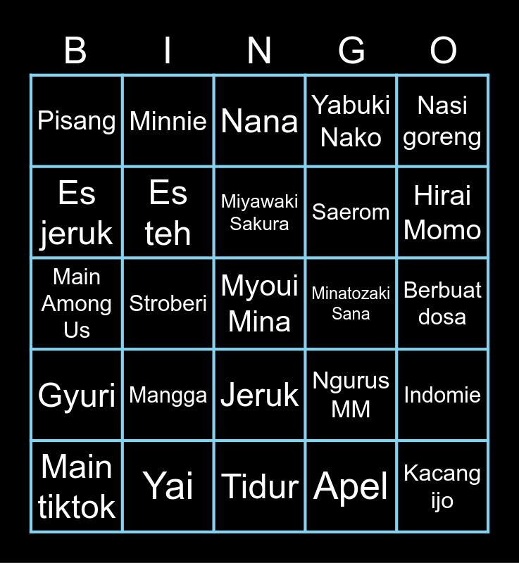 This bingo card has a free space and 24 words: Mangga, Yai, Miyawaki Sakura, Main tiktok, Nasi goreng, Pisang, Es jeruk, Minnie, Minatozaki Sana, Jeruk, Saerom, Main Among Us, Ngurus MM, Indomie, Es teh, Apel, Berbuat dosa, Nana, Hirai Momo, Stroberi, Kacang ijo, Gyuri, Yabuki Nako and Tidur.