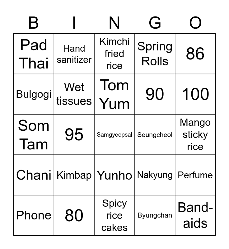 This bingo card has a free space and 24 words: Kimbap, 80, Tom Yum, Phone, 86, Pad Thai, Bulgogi, Hand sanitizer, Seungcheol, Yunho, 90, Som Tam, Nakyung, Perfume, Wet tissues, Byungchan, Mango sticky rice, Kimchi fried rice, 100, 95, Band-aids, Chani, Spring Rolls and Spicy rice cakes.