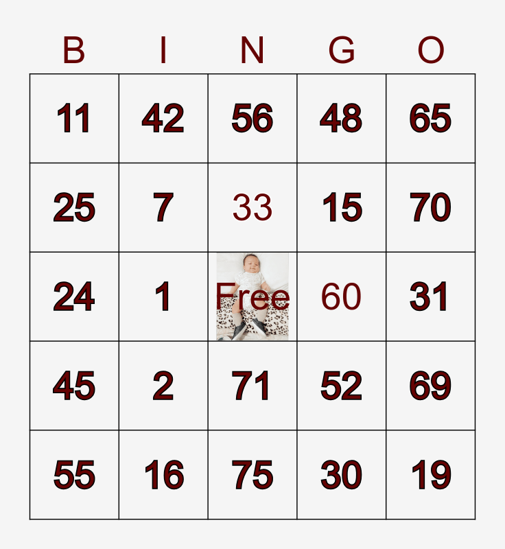 This bingo card has a free space and 24 words: 2, 16, 33, 55, 65, 11, 25, 42, 60, 71, 15, 24, 52, 69, 7, 30, 31, 56, 70, 1, 19, 45, 48 and 75.