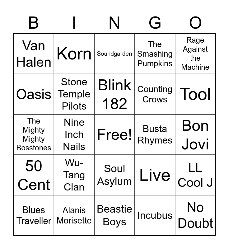 This bingo card has a free space and 75 words: Nirvana, Alice in Chains, Soundgarden, Green Day, Radiohead, Pearl Jam, REM, Foo Fighters, Red Hot Chili Peppers, Pantera, Metallica, Guns N’ Roses, Blink 182, Oasis, U2, Nine Inch Nails, Weezer, No Doubt, The Offspring, Rage Against the Machine, The Cranberries, The Mighty Mighty Bosstones, Stone Temple Pilots, Korn, The Smashing Pumpkins, Bush, Jane’s Addiction, Dream Theater, Blind Melon, Megadeth, Aerosmith, Faith No More, Dave Matthews Band, Live, Tool, Counting Crows, Creed, Hootie & The Blowfish, Bon Jovi, Incubus, Helmet, Sublime, Third Eye Blind, Our Lady Peace, Primus, Scorpions, Blues Traveller, Van Halen, Sepultura, The Black Crows, Def Leppard, Soul Asylum, Matchbox 20, Skid Row, White Zombie, 311, Limp Bizkit, Tupac Shakur, Ice Cube, The Notorious B.I.G., Wu-Tang Clan, Snoop Doggie Dogg, Eminem, A Tribe Called Quest, Dr. Dre, Busta Rhymes, DMX, Bones Thugs-N-Harmony, Cypress Hill, LL Cool J, 50 Cent, Alanis Morisette, Public Enemy, Beastie Boys and Ice-T.