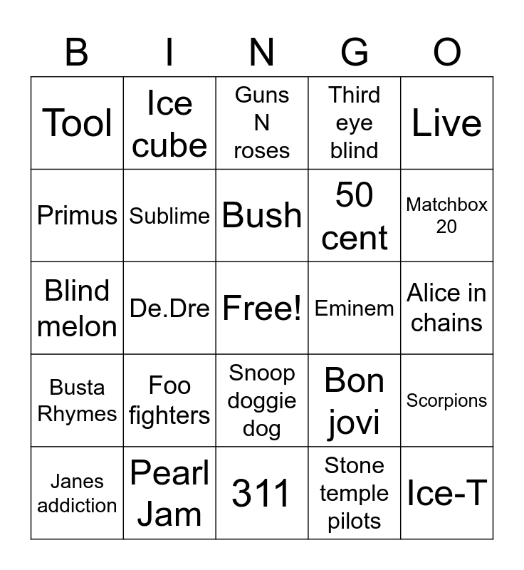This bingo card has a free space and 24 words: Foo fighters, Pearl Jam, Bush, Janes addiction, Live, Tool, Primus, Ice cube, Eminem, Snoop doggie dog, 50 cent, Blind melon, Bon jovi, Scorpions, Sublime, Stone temple pilots, Alice in chains, Guns N roses, Matchbox 20, De.Dre, Ice-T, Busta Rhymes, Third eye blind and 311.