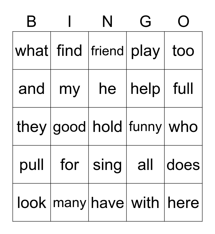 This bingo card has 25 words: for, have, he, look, too, what, and, find, funny, sing, help, they, all, does, my, here, who, friend, full, good, hold, many, pull, play and with.