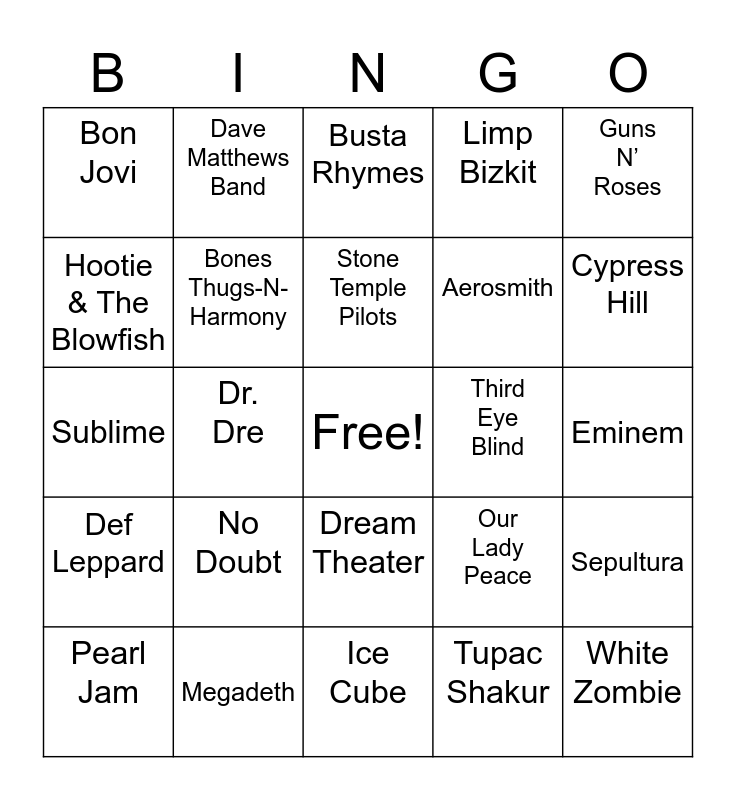 This bingo card has a free space and 24 words: No Doubt, Megadeth, Stone Temple Pilots, Pearl Jam, Guns N’ Roses, Bon Jovi, Hootie & The Blowfish, Dave Matthews Band, Third Eye Blind, Dream Theater, Aerosmith, Sublime, Our Lady Peace, Sepultura, Bones Thugs-N-Harmony, Tupac Shakur, Eminem, Busta Rhymes, Cypress Hill, Dr. Dre, White Zombie, Def Leppard, Limp Bizkit and Ice Cube.