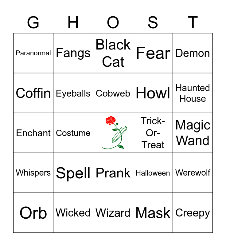 This bingo card has a free space and 75 words: Apparition, Bat, Black Cat, Blood, Bogeyman, Bones, Boo, Broomstick, Candy, Casper, Caulderon, Cemetery, Cobweb, Coffin, Cold Spot, Costume, Creaking Door, Creepy, Darkness, Demon, Dracula, Enchant, Eyeballs, Fangs, Fear, Fog, Frankenstein, Full Moon, Gasp, Ghost, Goblin, Graveyard, Grim Reaper, Halloween, Haunted House, Howl, Jack-O-Lantern, Magic, Magic Wand, Mask, Masquerade, Midnight, Monster, Mummy, Nightmare, October, Orb, Paranormal, Phantom, Poltergeist, Potion, Prank, Rats, Rattling Chains, Salem, Scream, Shadows, Skeleton, Skull, Snakes, Spell, Spirits, Spooky, Tapping, Tombstone, Trick-Or-Treat, Vampire, Vanish, Warlock, Werewolf, Whispers, Wicked, Witch, Wizard and Zombies.