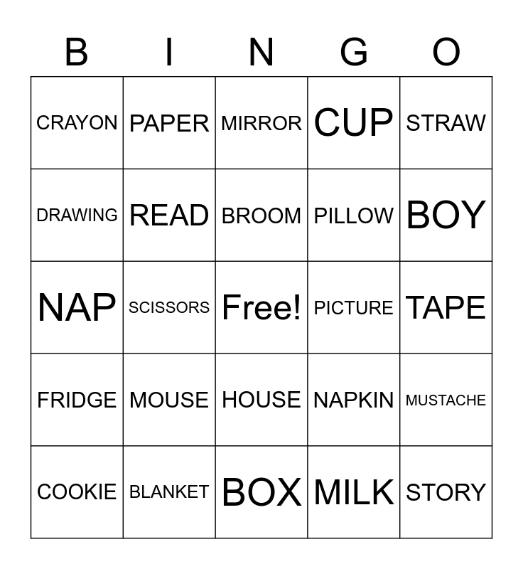This bingo card has a free space and 24 words: COOKIE, MOUSE, BROOM, MILK, STRAW, CRAYON, PAPER, MIRROR, PICTURE, TAPE, NAP, READ, NAPKIN, MUSTACHE, DRAWING, BLANKET, BOX, CUP, BOY, FRIDGE, SCISSORS, HOUSE, PILLOW and STORY.