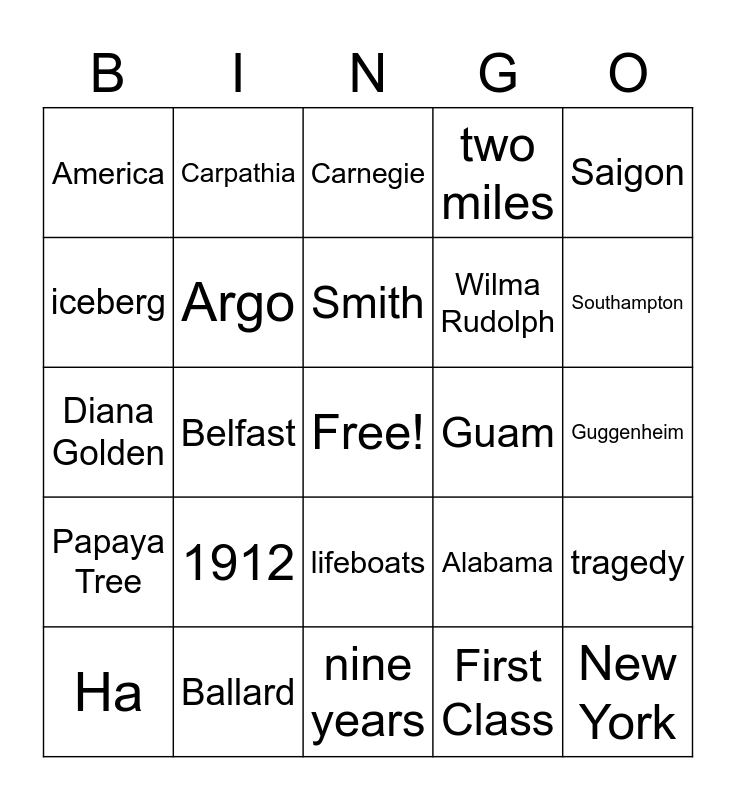 This bingo card has a free space and 24 words: 1912, Ballard, Smith, Ha, Saigon, America, iceberg, Carpathia, Guam, lifeboats, Wilma Rudolph, Diana Golden, Alabama, tragedy, Argo, First Class, Guggenheim, Carnegie, Southampton, Belfast, New York, Papaya Tree, two miles and nine years.