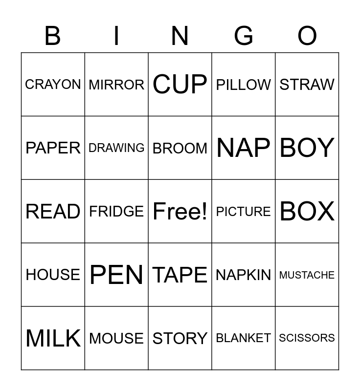 This bingo card has a free space and 24 words: PEN, MOUSE, BROOM, MILK, STRAW, CRAYON, PAPER, MIRROR, PICTURE, TAPE, NAP, READ, NAPKIN, MUSTACHE, DRAWING, BLANKET, BOX, CUP, BOY, FRIDGE, SCISSORS, HOUSE, PILLOW and STORY.