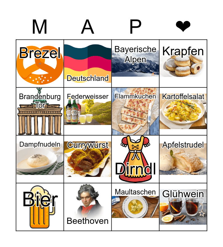 This bingo card has 20 images and 20 words: Apfelstrudel, Autobahn, Bayerische Alpen, Bamberg, Bier, Brandenburg Tor, Beethoven, Brezel, Dampfnudeln, Deutschland, Currywurst, Dirndl, Federweisser, Glühwein, Flammkuchen, Karneval, Kartoffelsalat, Krapfen, Maultaschen and Schaumkuss.