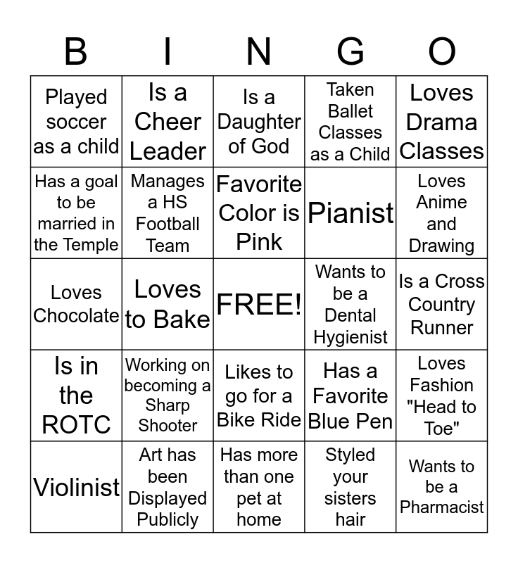 This bingo card has a free space and 24 words: Working on becoming a Sharp Shooter, Art has been Displayed Publicly, Favorite Color is Pink, Violinist, Loves Drama Classes, Played soccer as a child, Has a goal to be married in the Temple, Is a Cheer Leader, Wants to be a Dental Hygienist, Likes to go for a Bike Ride, Pianist, Loves Chocolate, Has a Favorite Blue Pen, Loves Fashion "Head to Toe", Manages a HS Football Team, Styled your sisters hair, Is a Cross Country Runner, Is a Daughter of God, Loves Anime and Drawing, Loves to Bake, Wants to be a Pharmacist, Is in the ROTC, Taken Ballet Classes as a Child and Has more than one pet at home.