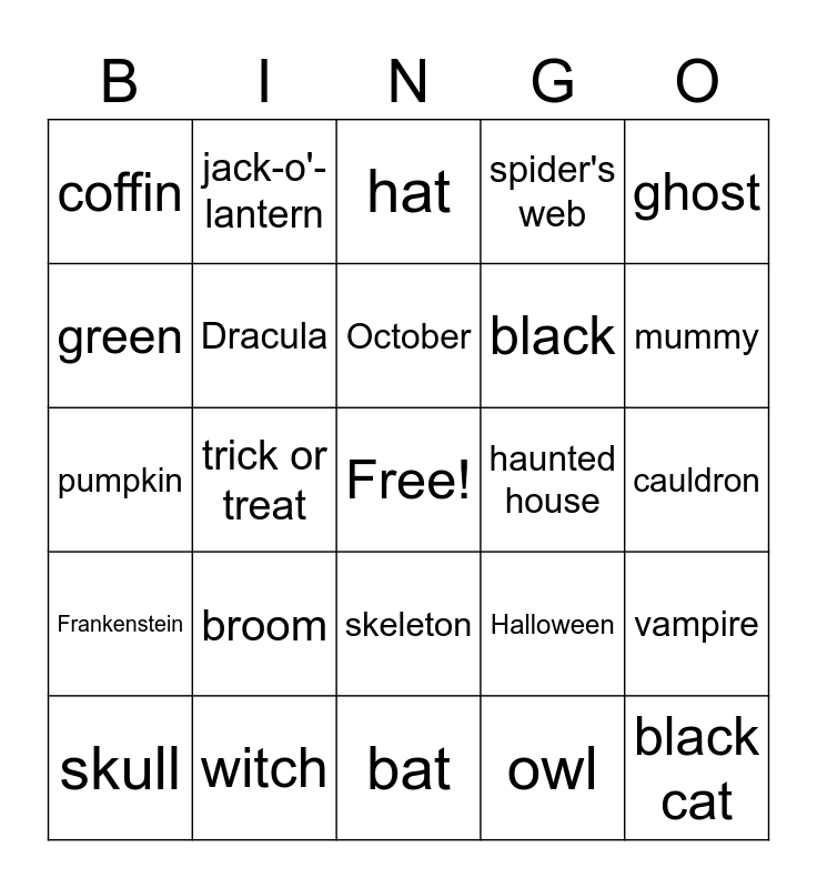 This bingo card has a free space and 29 words: skull, spider, trick or treat, grave, coffin, hat, Dracula, broom, haunted house, witch, cauldron, black cat, bat, owl, mummy, candy, skeleton, Frankenstein, ghost, pumpkin, Halloween, orange, black, green, spider's web, jack-o'-lantern, vampire, October and zombie.