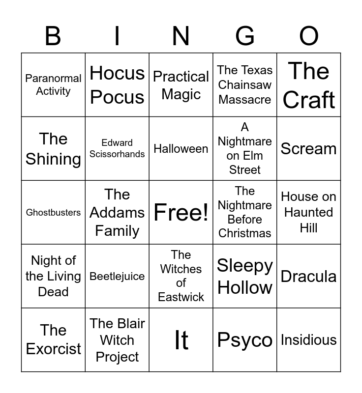 This bingo card has a free space and 24 words: Beetlejuice, The Blair Witch Project, Halloween, The Exorcist, The Craft, Paranormal Activity, The Shining, Hocus Pocus, The Nightmare Before Christmas, The Witches of Eastwick, A Nightmare on Elm Street, Ghostbusters, Sleepy Hollow, Dracula, Edward Scissorhands, Psyco, House on Haunted Hill, Practical Magic, Scream, The Addams Family, Insidious, Night of the Living Dead, The Texas Chainsaw Massacre and It.