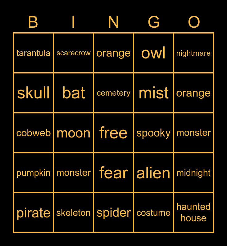 This bingo card has a free space and 24 words: pirate, monster, cemetery, costume, nightmare, tarantula, scarecrow, orange, spooky, monster, cobweb, bat, alien, midnight, skull, skeleton, spider, owl, orange, pumpkin, moon, fear, mist and haunted house.