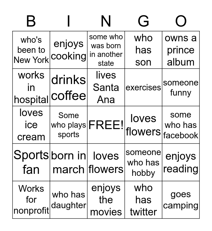 This bingo card has a free space and 24 words: born in march, who has daughter, lives Santa Ana, Works for nonprofit, owns a prince album, who's been to New York, works in hospital, enjoys cooking, loves flowers, loves flowers, exercises, loves ice cream, someone who has hobby, enjoys reading, drinks coffee, who has twitter, some who has facebook, some who was born in another state, someone funny, Some who plays sports, goes camping, Sports fan, who has son and enjoys the movies.