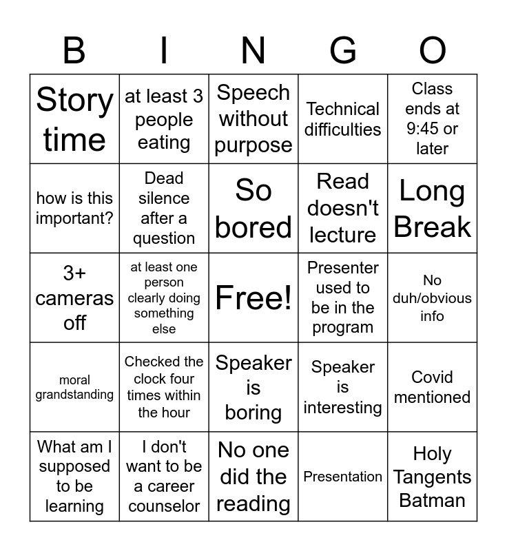 This bingo card has a free space and 26 words: Speaker is boring, Presentation, So bored, I don't want to be a career counselor, Class ends at 9:45 or later, Story time, how is this important?, at least 3 people eating, No duh/obvious info, Speaker is interesting, Read doesn't lecture, 3+ cameras off, Covid mentioned, What am I supposed to be learning, at least one person clearly doing something else, Growing frustration, Technical difficulties, moral grandstanding, Speech without purpose, Holy Tangents Batman, Long Break, No one did the reading, Presenter used to be in the program, Checked the clock four times within the hour, Dead silence after a question and Feeling burnt out/cranky.