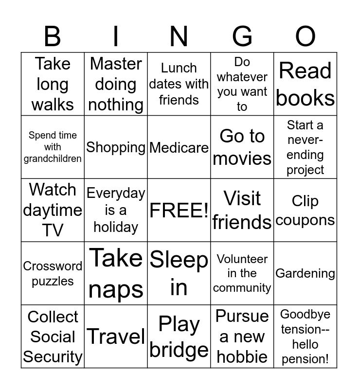 This bingo card has a free space and 24 words: Take naps, Travel, Medicare, Collect Social Security, Read books, Take long walks, Spend time with grandchildren, Master doing nothing, Visit friends, Sleep in, Go to movies, Watch daytime TV, Volunteer in the community, Gardening, Shopping, Pursue a new hobbie, Clip coupons, Lunch dates with friends, Start a never-ending project, Everyday is a holiday, Goodbye tension--hello pension!, Crossword puzzles, Do whatever you want to and Play bridge.