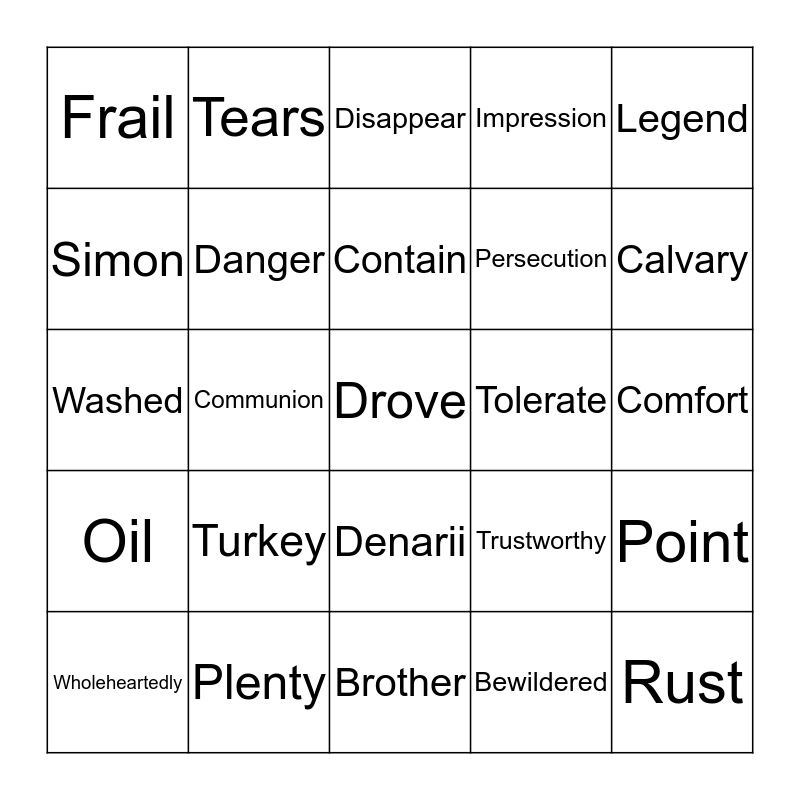 This bingo card has 25 words: Turkey, Brother, Contain, Wholeheartedly, Legend, Frail, Simon, Tears, Tolerate, Denarii, Persecution, Washed, Trustworthy, Point, Danger, Rust, Comfort, Disappear, Calvary, Communion, Drove, Plenty, Oil, Impression and Bewildered.