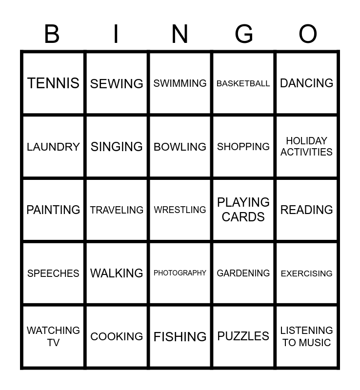 This bingo card has 25 words: WALKING, FISHING, BOWLING, WATCHING TV, DANCING, TENNIS, LAUNDRY, SEWING, PLAYING CARDS, PHOTOGRAPHY, SHOPPING, PAINTING, GARDENING, EXERCISING, SINGING, LISTENING TO MUSIC, READING, SWIMMING, HOLIDAY ACTIVITIES, TRAVELING, WRESTLING, COOKING, SPEECHES, BASKETBALL and PUZZLES.